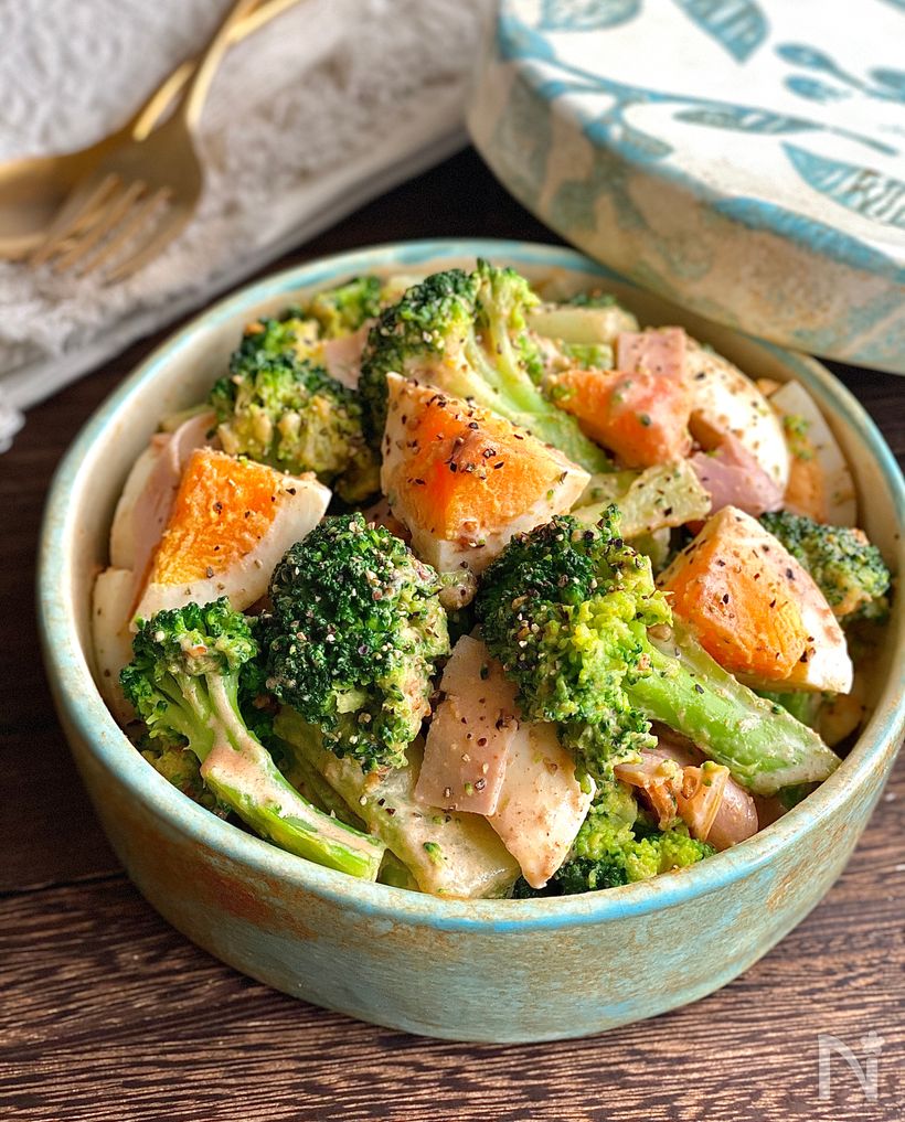 - 食べやすい大きさに切ったハム、8等分にした茹で卵、ブロッコリーをボウルに入れ、【A】の調味料を加えて卵が崩れないように優しく混ぜる。